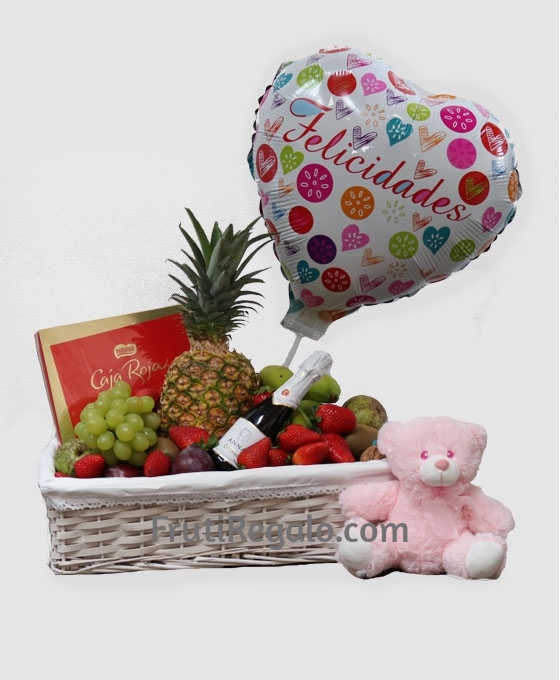 A cualquier cesta de frutas, se le puede adjuntar algún complemento de los que ponemos a disposición de nuestros clientes en Fruti Regalo. Puede ser; peluche, botellas de vino, champagne, bombones…